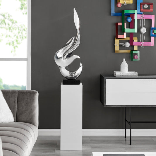 Chrome Flame Floor Sculpture With White Stand, 65" Tall