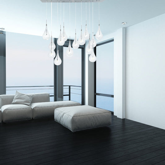 Modern Glass Drops Chandelier - 14 Lights, Rectangular Chrome Canopy, Adjustable Height