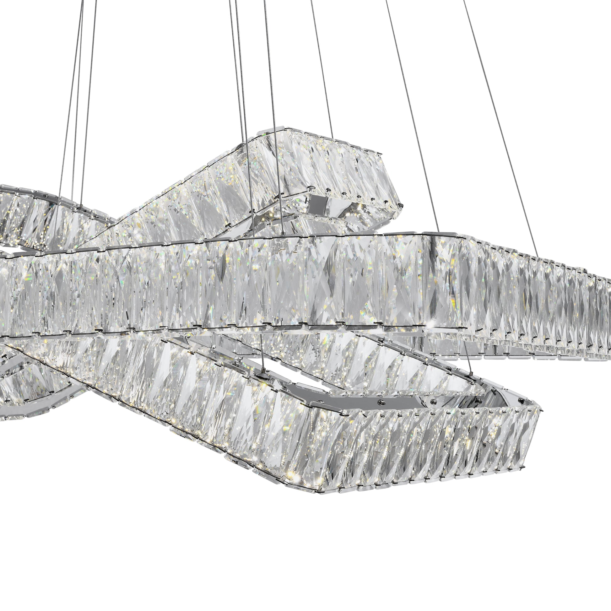 Transform your space with the Crystal Elegance LED Chandelier, featuring three elegant rectangular rings that can be adjusted to your liking. This Finesse Decor chandelier combines modern design with luxurious crystal accents, making it the perfect centerpiece for your dining room or living space.
